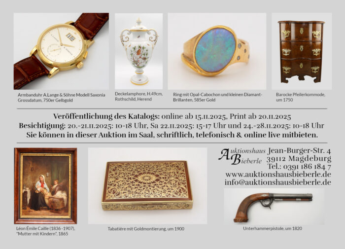 Ob Kunstgegenstände, Antiquitäten, Schmuck, gehobener Hausrat o.ä.: Wir nehmen Einlieferungen ständig entgegen. Alle Informationen zur Einlieferung erhalten Sie hier. Gern beraten wir Sie auch vorab telefonisch unter 0391 186 184 7 oder per E-Mail – sprechen Sie uns einfach an!