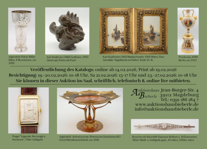 Ob Kunstgegenstände, Antiquitäten, Schmuck, gehobener Hausrat o.ä.: Wir nehmen Einlieferungen ständig entgegen. Alle Informationen zur Einlieferung erhalten Sie hier. Gern beraten wir Sie auch vorab telefonisch unter 0391 186 184 7 oder per E-Mail – sprechen Sie uns einfach an!